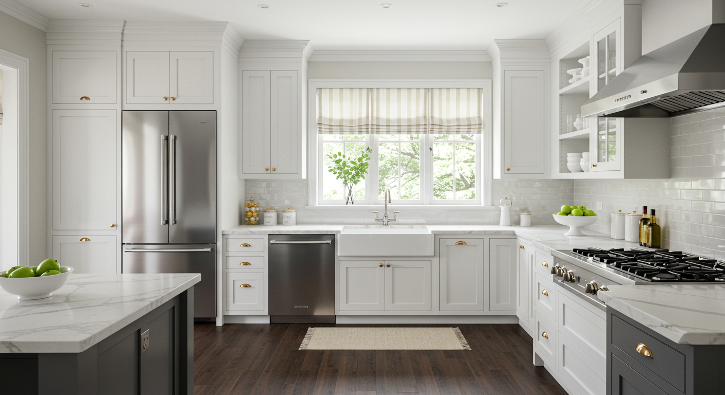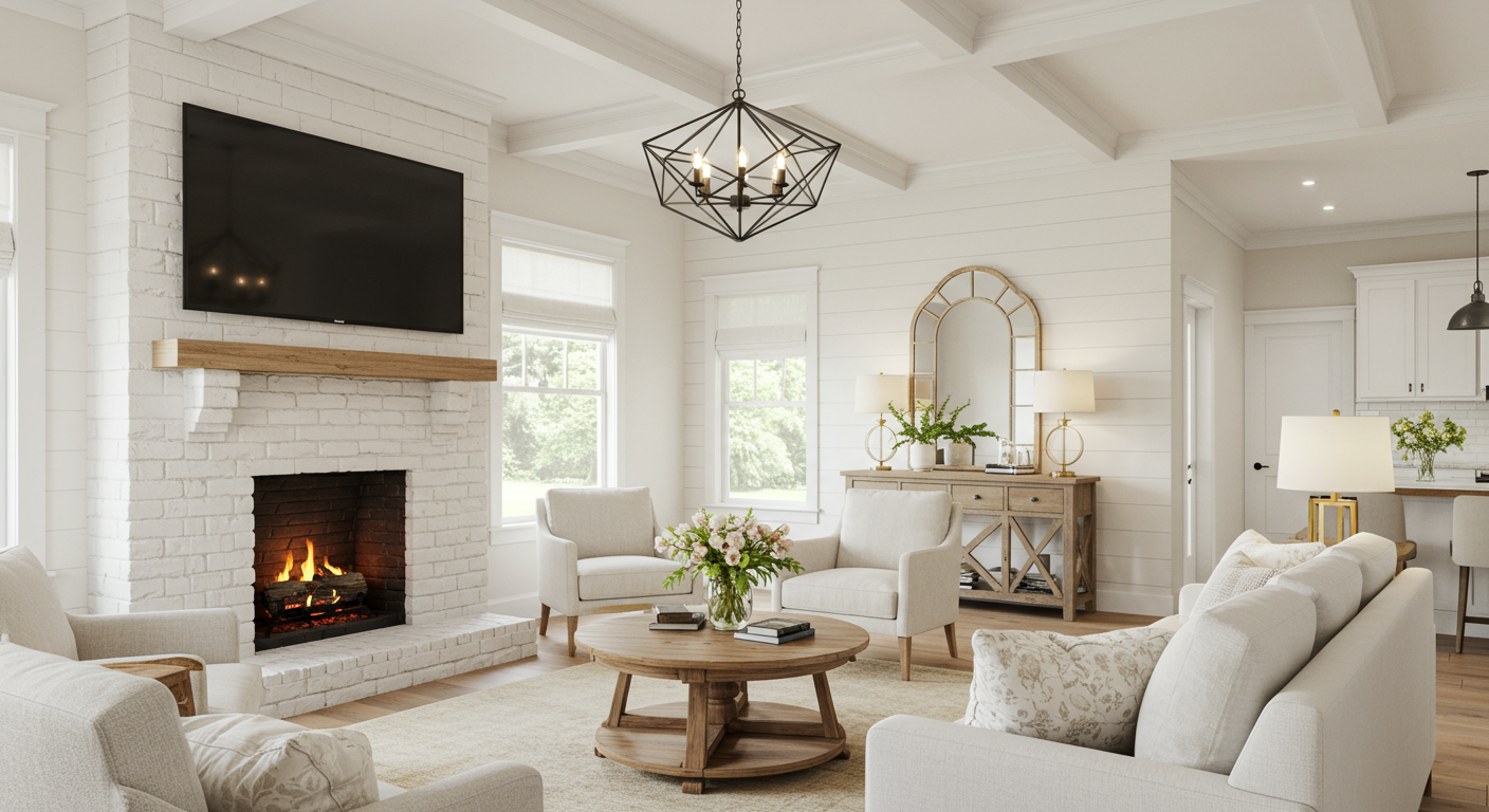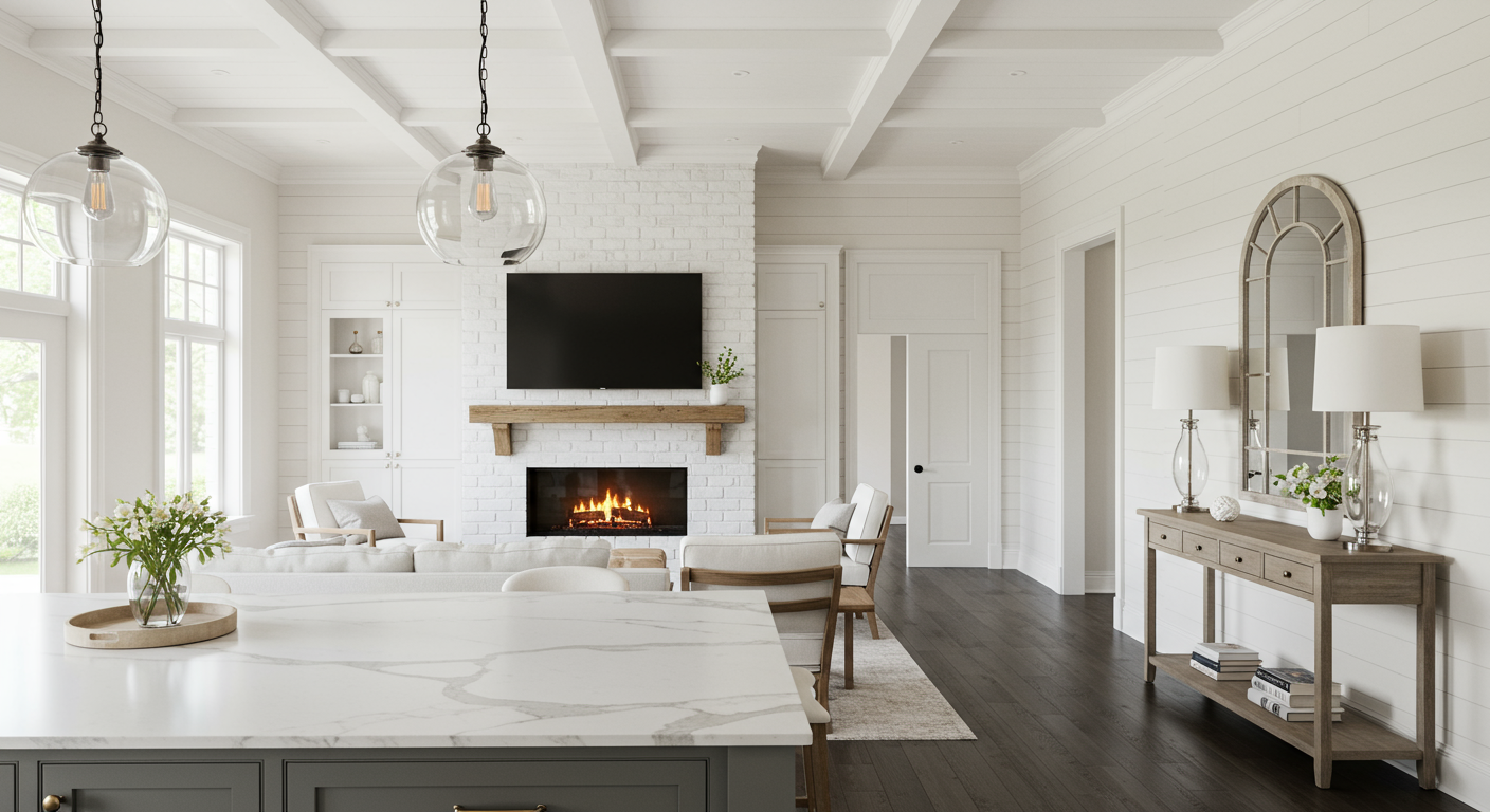 The recent shiplap family room addition is open to the newly renovated kitchen, complete with stainless steel appliances and marble countertops. No detail was overlooked!