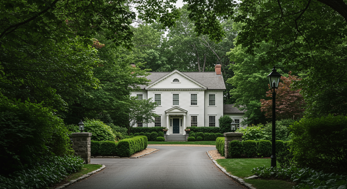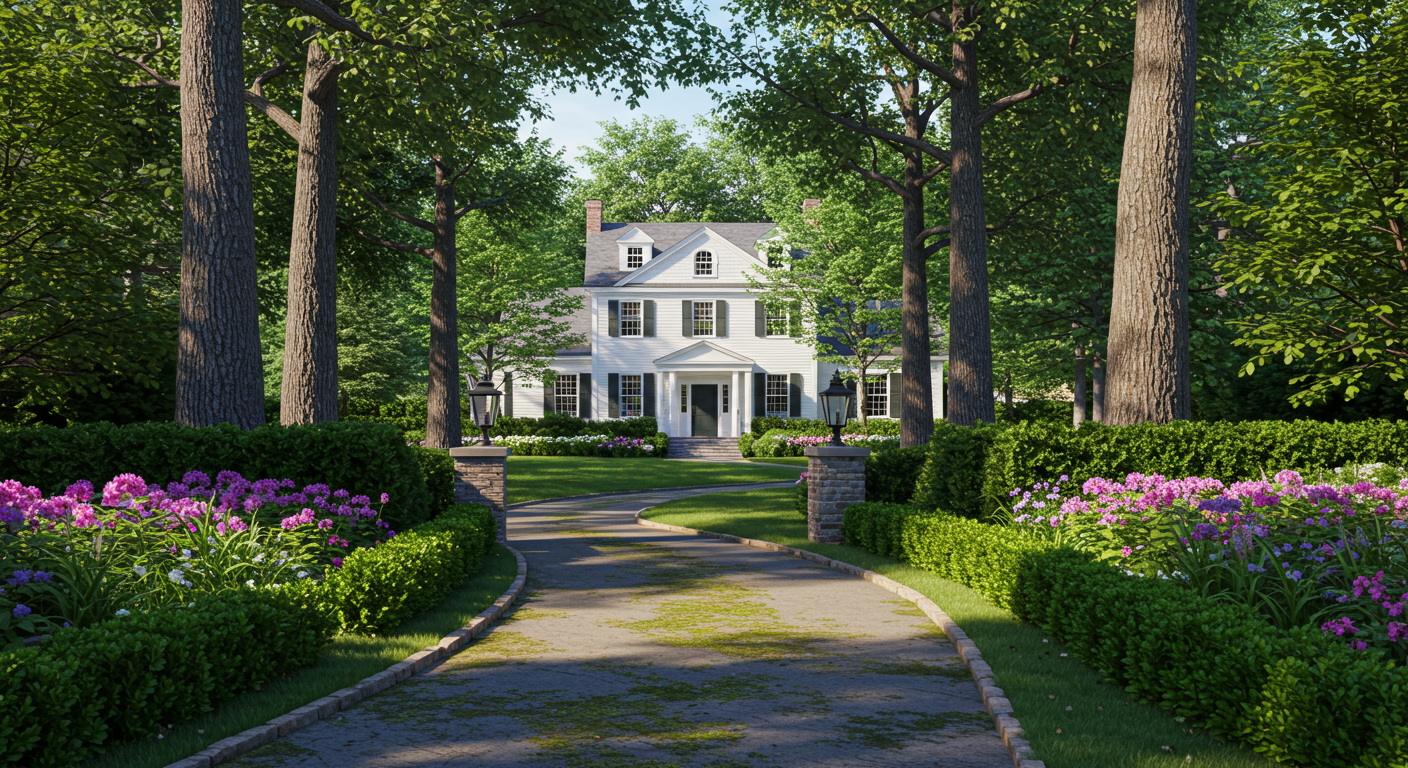 One Austell Way appears at the crest of a long, tree-lined driveway. The classic, clapboard home with a stone granite and brick base is perfectly sited at the midpoint of its 1.39 acres of beautifully manicured gardens and private green spaces. Its circular motor court of pebbled stone was, interestingly, once a front yard swimming pool for previous owners and converted in the 70s to offer an abundance of parking spaces for entertaining.
