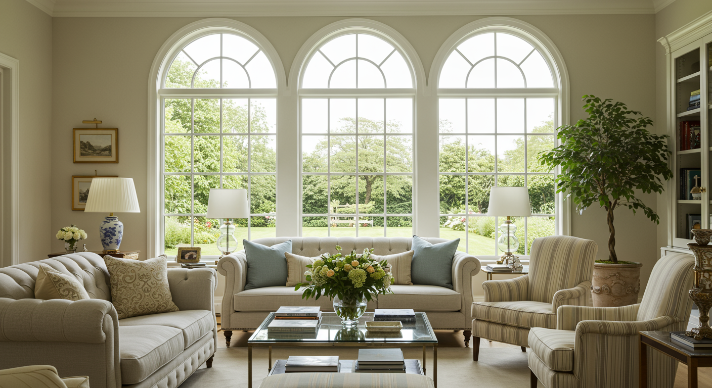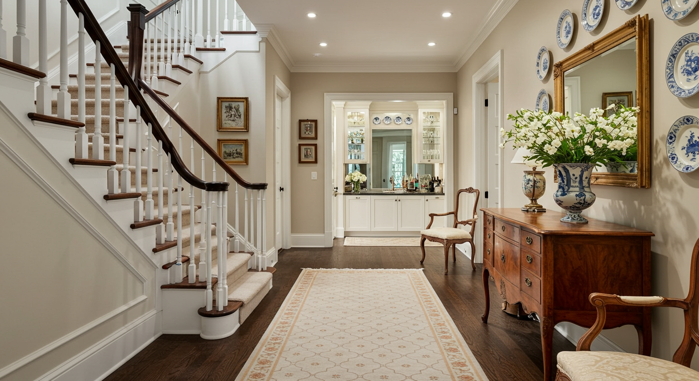Upon stepping from the front door and into the two-story foyer, one is welcomed by light and space. Warm hardwood floors and a mirrored bar reflect the light down the hall and instantly debut the home as a haven for entertaining friends and family. Or, the antique door to the bar can be closed to better display the simplicity of the entry hall. A cozy library to the right of the entry is a brief encounter before continuing to the light-filled living room designed with 3 two-story floor-to-ceiling Palladian Windows along the west wall with a working fireplace opposite.