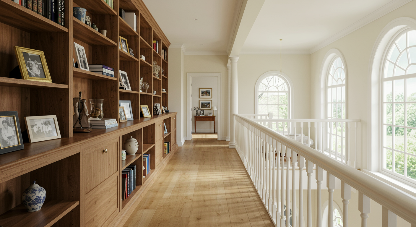 An open, upper gallery with bookshelves and a railing overlooks the beautiful living room and its three, amazing two-story Palladian windows.