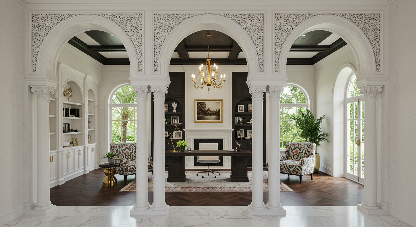 Tackle your to-do list in the office, complete with paneling and tray ceilings. It’s ideal for working remotely. The owner’s suite is located on the main level with a relaxing sitting area, a master bath with an enormous spa tub, and a frameless shower. All secondary bedrooms boast unique architectural detail and offer private baths and walk-in closets.